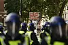 Demonstranter drabbar samman med polis nära premiärministerns bostad i London på onsdagen.