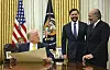 President Donald Trump, till vänster, talar under en ceremoniell edsavläggning för handelsminister Howard Lutnick, till höger, medan vicepresident JD Vance lyssnar.Foto: Pool via AP/TT