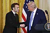 President Donald Trump, till höger, och Frankrikes president Emmanuel Macron skakar hand under en gemensam presskonferens i Östra rummet i Vita huset i Washington, måndagen den 24 februari.Foto: Ludovic Marin/TT