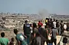 Palestinier ser rök stiga efter israeliska flygangrepp vid kusten nordväst om flyktinglägret Nuseirats i Gazaremsan 1 oktober 2025.