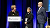 Karin Wiborn och Niklas Piensoho (t h) valdes på fredagen till kyrkoledare respektive biträdande kyrkoledare i Equmeniakyrkan. Här presenteras de av kyrkostyrelsens ordförande, Kerstin Edlund.